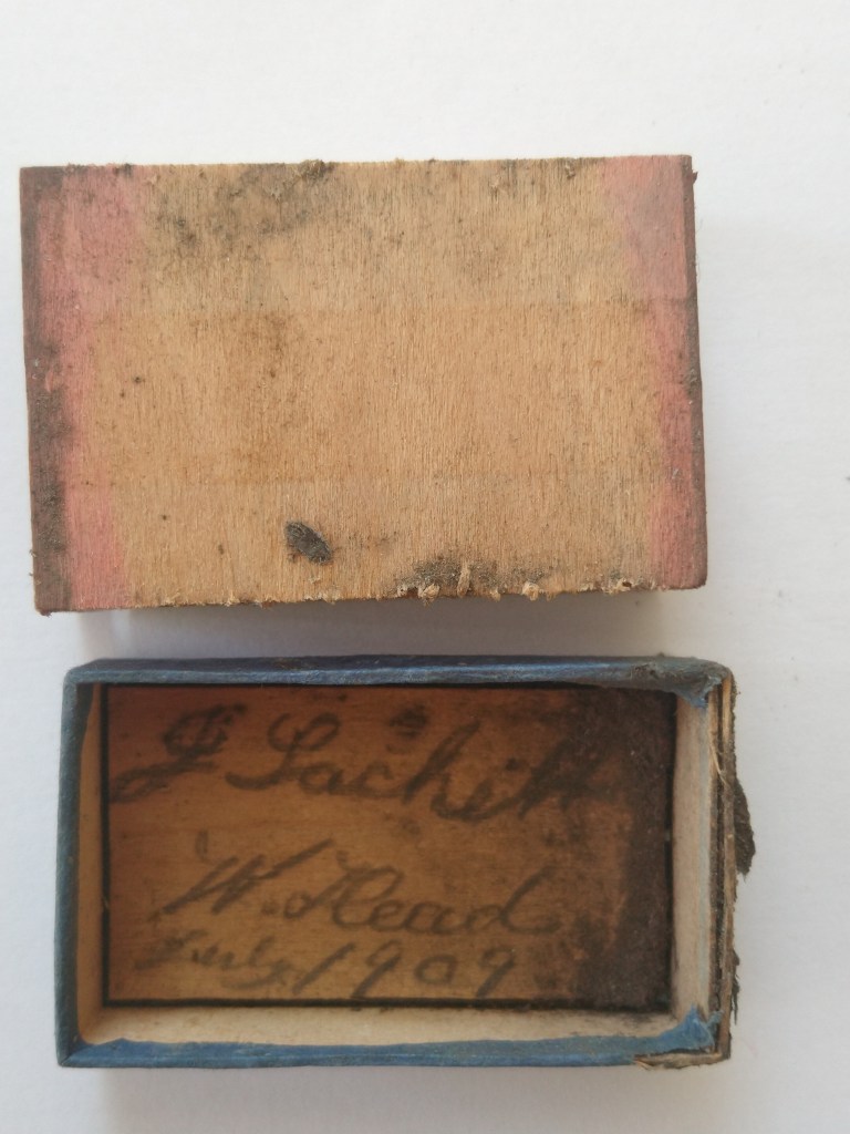 One interesting little artefact was discovered under the old floor. An old-style wooden matchbox, which although empty, was found to contain two names and a date written by hand inside. These appear to read ‘J.Lachett’ and ‘W. Head’ together with the date July 1909. We know from records that the Hall was built in 1909, so one could imagine that these persons were workmen having a smoke who decided on the spur of the moment to leave a little informal record for future generations to find 114 years later! One wonders how things worked out for them as World War One was then only five years in the future.
