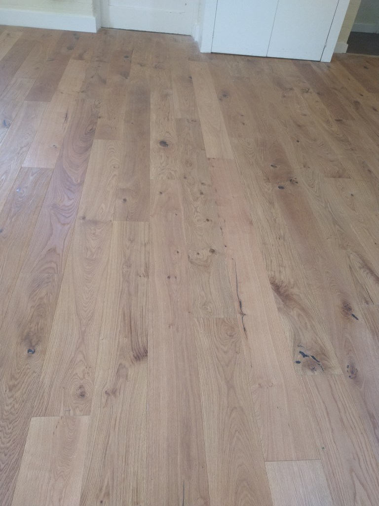 The new floor is 21mm thick (15mm tongue and groove plywood with a 6mm oak veneer). It has an oiled matt finish and maintenance consists of a light re-oiling once per year. The total cost of the project was £7313.60 and the old pine flooring was collected for recycling.