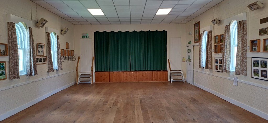 The Hall which measures 12 metres by 7 metres, has a stage, a stage store room and a separate meeting room, a new well-equipped Kitchen, Toilets and Accessible Toilet.